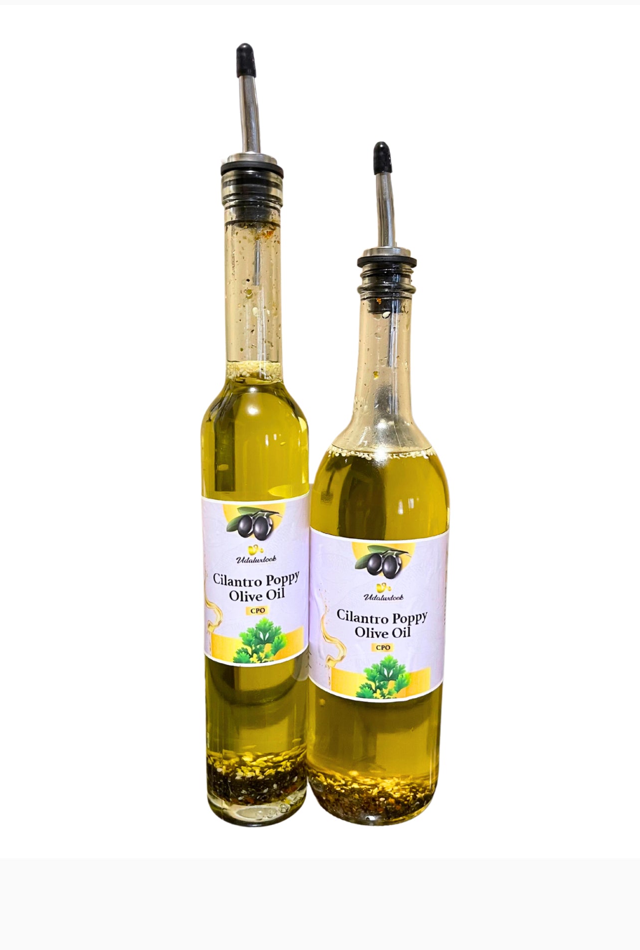 CPO: Cilantro Poppy Olive Oil is a premium combination of classic olive oil and the aromatic notes of cilantro and poppy seed. With a rich, velvety consistency and an irresistible flavor, this oil is ideal for enhancing salads and grilled vegetables. Its natural high smoke point also makes it well-suited for cooking. Meticulously crafted for both professional chefs and home cooks, CPO adds a delightful touch of taste and complexity to any meal. Ingredients: Organic extra virgin olive oil, poppy seeds, minced garlic, seasoned salt.