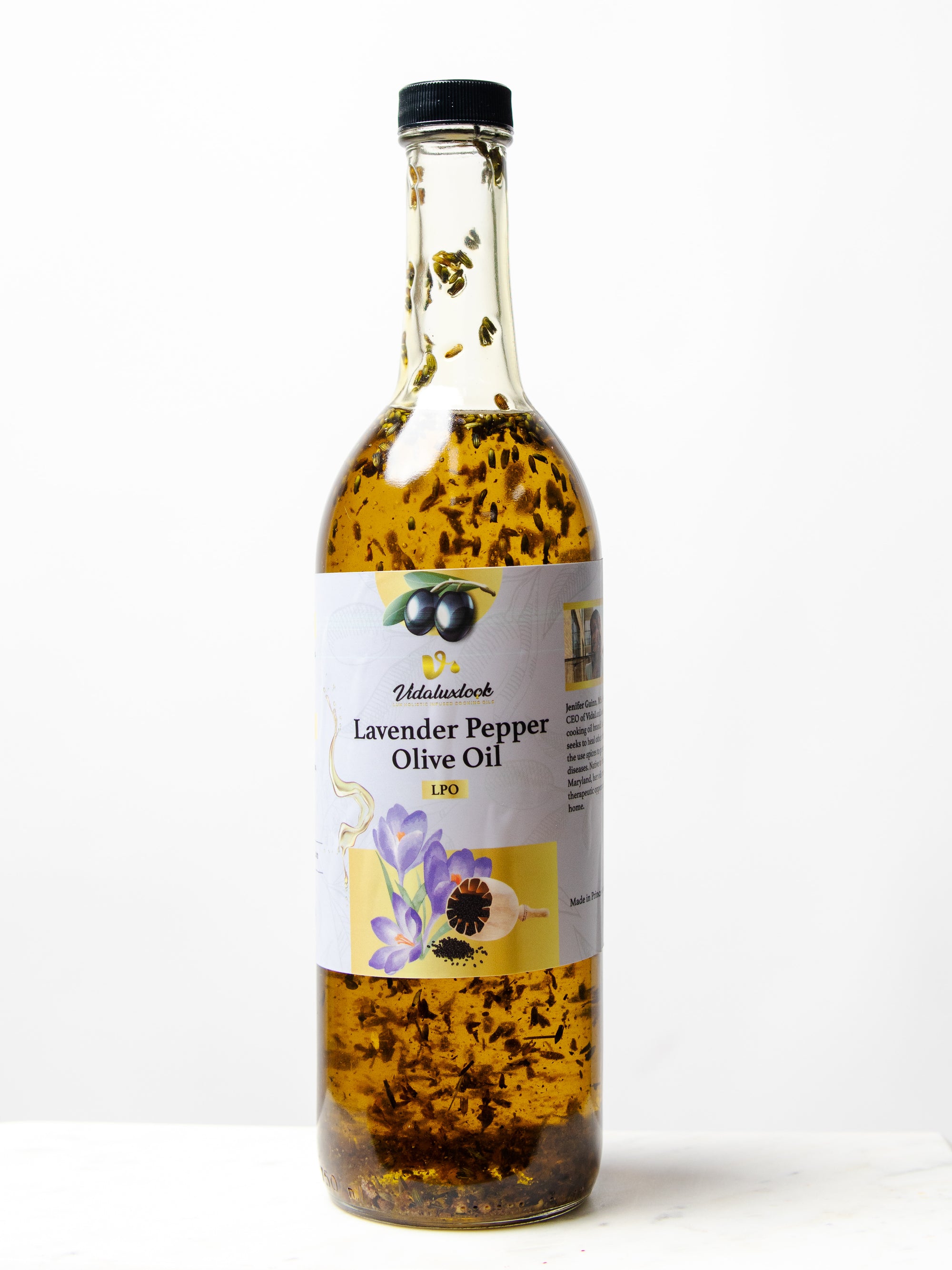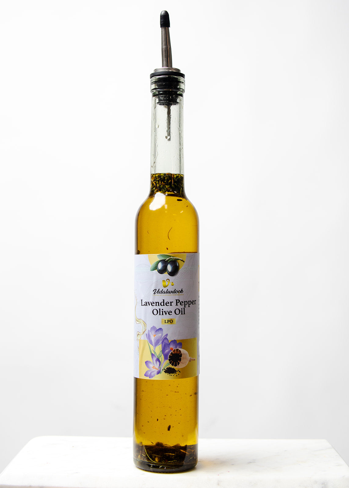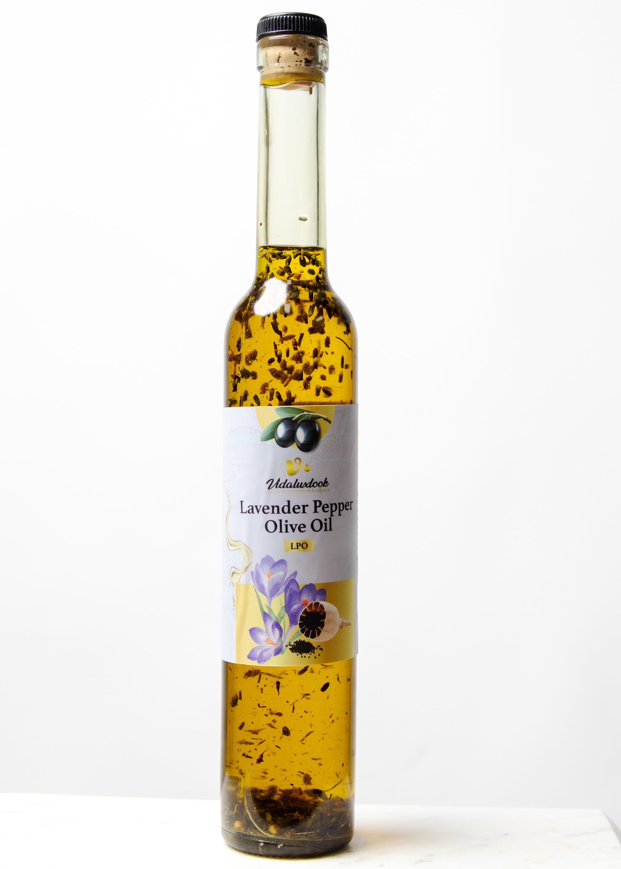 Discover the ultimate combination of organic extra virgin olive oil, dried lavender buds, garlic, peppercorns, thyme, pink sea salt, lemon oil, and lemon peel with LPO: Lavender Pepper Olive Oil. Enhance the taste of your salads, marinades, and sauces with this exceptional blend.